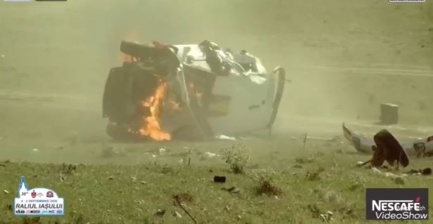 Incident la raliul Iașiului! O mașină s-a răsturnat și a luat foc