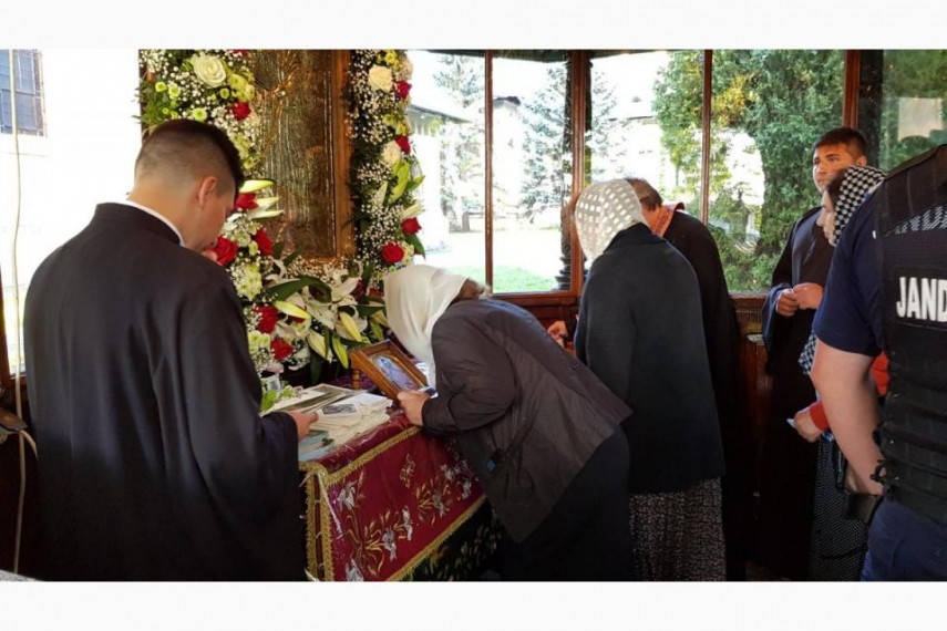 Racla cu sfintele moaște a fost așezată spre închinare în spațiul special amenajat din curtea așezământului monahal.
