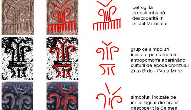 Braşoveanul crede că inelul pe care l-a scos la iveală în urma săpăturilor de la Seimeni „ar putea reprezenta o dovadă a continuităţii utilizării unor semne grafice comune pe o arie extinsă în sud-estul Europei, pe o perioadă de câteva milenii. Dacă analogiile cu simbolurile utilizate în culturile din epoca bronzului Žuto Brdo - Gârla Mare, Cruceni - Belegis, Verbicioara sunt explicabile, similitudinile cu petroglifele precolumbiene sunt de neînţeles“, apreciază Pintilie.„Un grup de arheologi au descoperit în vestul Mexicului 30 de petroglife, executate în stâncă de populaţia precolumbiană, care fac parte din complexul arheologic El Cerro de la Máscara, amplasat în vestul Mexicului, şi a căror vârstă este estimată între 800 şi 2500 de ani. Acestea sunt identice cu simbolurile incizate pe inelul sigilar descoperit la Seimeni şi cu grupul de simboluri incizate în partea superioară a statuetelor antropomorfe aparţinând culturii Žuto Brdo - Gârla Mare. De când am descoperit această analogie, mă întreb daca ar putea fi o pură coincidenţă şi de fiecare dată ajung la concluzia că este puţin probabil să fie aşa“, a conchis Cristian Pintilie.