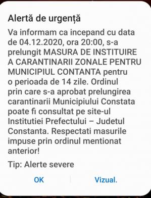 Ieri a fost publicat în Monitorul Oficial al României Partea I numărul 1261 din 19.XII.2020 Ordinul 4.660.442 semnat de Raed Arafat, șeful Departamentului pentru Situații de Urgență, de prelungirea măsurii de carantinare zonală pentru orașul Ovidiu, județul Constanța, pentru o perioadă de 14 zile începând cu data de 19 decembrie ora 20.00.