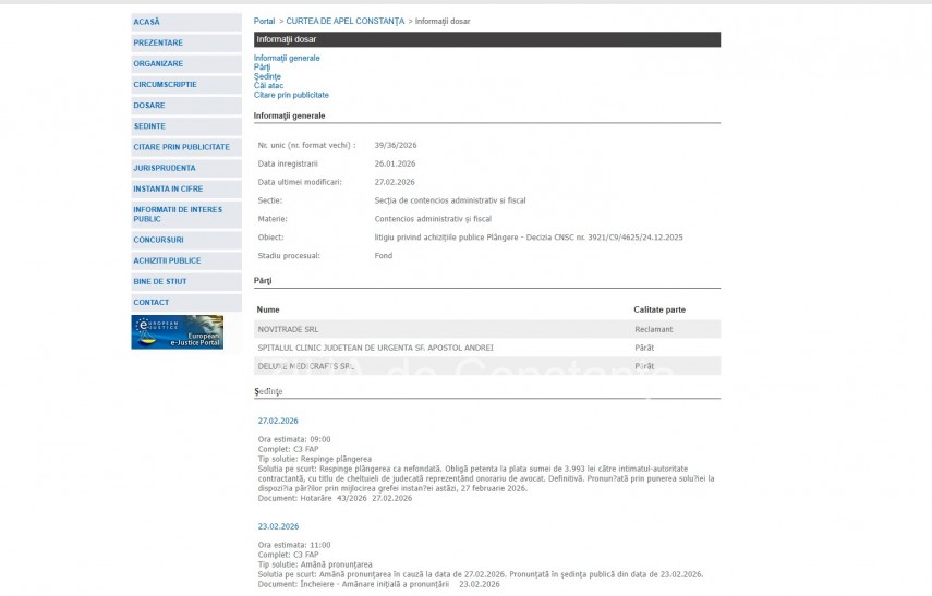 Un nou dosar de contencios administrativ și fiscal (nr. 39/36/2026) a fost înregistrat la Curtea de Apel Constanța, pe data de 26 ianuarie 2026, având ca obiect o plângere împotriva Deciziei CNSC nr. 3921/C9/4625 din 24.12.2025.Părți în dosar sunt Novitrade SRL - reclamant, Spitalul Clinic Județean de Urgență „Sf. Apostol Andrei” Constanța și Deluxe Medicrafts SRL - pârâți.