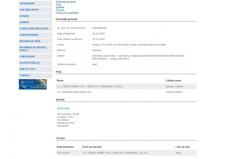 Pe rolul Curții de Apel Constanța se află dosarul cu numărul de înregistrare 183/88/2025 înregistrat la data de 16 decembrie 2025 la Secția a II-a Civilă, de insolvenţă şi litigii cu profesionişti şi societăţi. Dosarul are ca obiect procedura insolvenţei – societăţi cu răspundere limitată DESCHIDEREA PROCEDURII INSOLVENŢEI - Legea nr.85/2014 și se află în stadiul procesual de apel.Părți în dosar sunt S.C. FINECO ADMAT S.R.L. PRIN LICH. ROMINSOL I.P.U.R.L.– Apelant Creditor și S.C. MINERVA INFOCONS S.R.L.– Intimat Debitor.