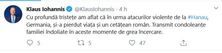 Preşedintele Klaus Iohannis a transmis, vineri dimineaţa, condoleanţe familiei românului care a murit în atacurile de la Hanau, Germania.