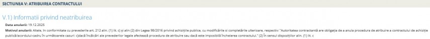Procedura de atribuire a contractului a fost anulată la data de 19 decembrie 2025. Motivul pentru această decizie a autorității contractante ține de încălcări ale prevederilor legale/imposibilitatea încheierii contractului.