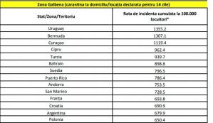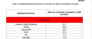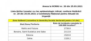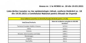 Comitetul Național pentru Situații de Urgență (CNSU) a adoptat astăzi lista țărilor/zonelor/teritoriilor de risc epidemiologic ridicat pentru care se instituie măsura carantinei asupra persoanelor care sosesc în România din acestea, prevăzută în anexa la prezenta.