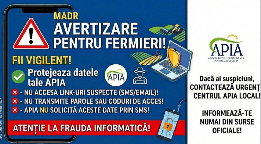 Ministerul Agriculturii și Dezvoltării Rurale îi avertizează pe fermieri și pe toți beneficiarii plăților gestionate de APIA să manifeste maximă prudență în privința mesajelor primite pe telefon sau online, care pot urmări obținerea ilegală a datelor de acces în conturile personale.