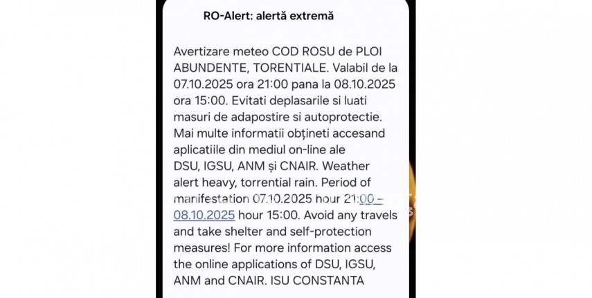Conform ANM, a fost emis un cod roșu de ploi torențiale și abundente în perioada 7 octombrie, ora 21:00 - 8 octombrie, ora 15:00 în județele Constanța, Călărași, Ialomița, Giurgiu, Ilfov și în municipiul București.Avertizare meteo Cod Roșu de ploi abundente, tortențiale. Valabil de la 7.10.2025 ora 21.00 până la 8.10.2025 ora 15.00 Evitați deplasările și luați măsuri de adăpostire și autoprotecție. Mai multe informații obțineți accesând aplicațiile din mediul on-line ale DSU, IGSU, ANM și CNAIR.“ - se arată în mesajul transmis către populație.