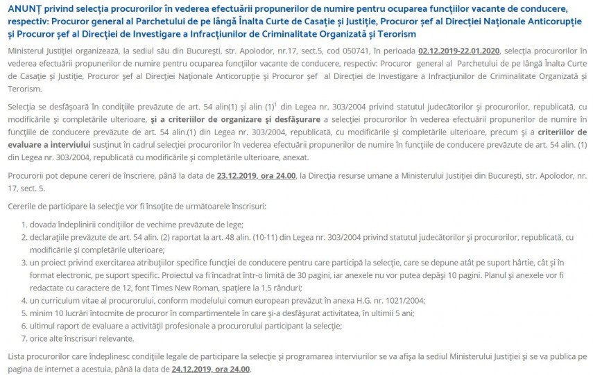 Ministerul Justiţiei a declanşat procedura de selecţie pentru propunerile de numire la şefia PÎCCJ, DNA şi DIICOT (document)