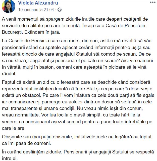 Violeta Alexandru, ministrul Muncii, a anunțat, într-o postare pe Facebook, că vrea „să spargă zidurile” de la Casele de Pensii și că va începe cu Bucureștiul. „ A venit momentul să spargem zidurile inutile care despart cetățenii de serviciile de calitate pe care le merită. Încep cu o Casă de Pensii din București. Extindem în țară.