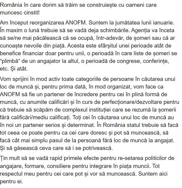 Țin mult să se vadă rapid primele efecte pentru re-setarea politicilor de angajare, formare, consiliere pentru integrare în piața muncii. Tot respectul meu pentru cei care pot și vor să muncească. Suntem aici pentru ei.