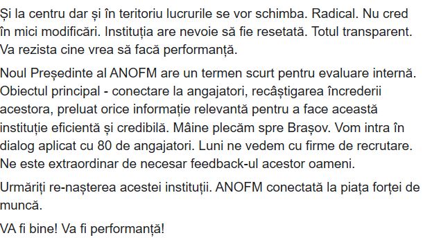 Noul Președinte al ANOFM are un termen scurt pentru evaluare internă. Obiectul principal - conectare la angajatori, recâștigarea încrederii acestora, preluat orice informație relevantă pentru a face această instituție eficientă și credibilă. Mâine plecăm spre Brașov. Vom intra în dialog aplicat cu 80 de angajatori. Luni ne vedem cu firme de recrutare. Ne este extraordinar de necesar feedback-ul acestor oameni.