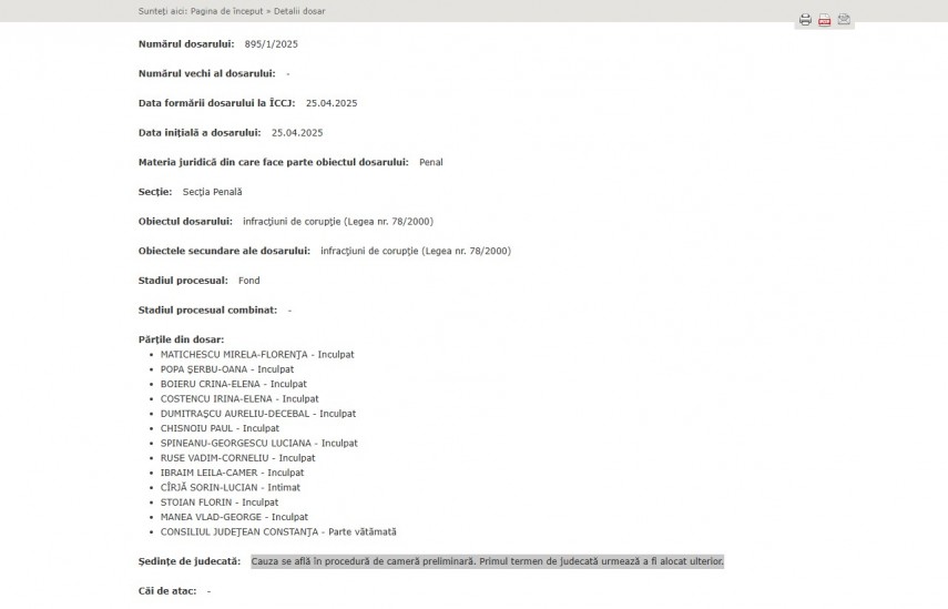 Dosarul 895/1/2005 a fost înregistrat la Înalta Curte de Casație și Justiție – Secția Penală la data de 25 aprilie 2025, iar alături de Mirela Matichescu mai sunt inculpați alți unsprezece angajați ai Consiliului Județean Constanța.