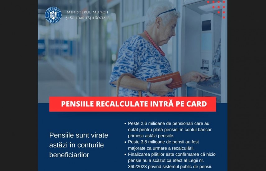 Citește și:„Din totalul de 4,6 milioane de pensii din sistemul public, aproximativ 82,5% au crescut la recalculare. Finalizarea plăților este confirmarea că nicio pensie nu a scăzut. Scopul legii este eliminarea inechităților între pensionari și întărirea principiului contributivității. Legea asigură creșterea anuală a pensiilor,dar și predictibilitate, atât pentru pensionari, cât și pentru angajați.”, a declarat Simona Bucura-Oprescu, ministrul Muncii și Solidarității Sociale.