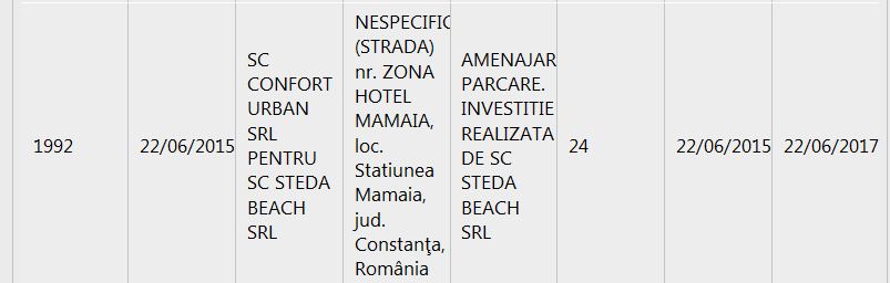 Pe data de 14 aprilie 2014, Primăria Constanţa a eliberat autorizaţia de construire nr. 433 pentru SC Steda Beach SRL, care intenţiona să ridice un imobil P+3-4 retras, cu funcţiunea complex hotelier şi alimentare publică. Zona vizată pentru această investiţie este staţiunea Mamaia, în apropierea hotelului Iaki. Astfel, aici se vor amenaja un hotel, un restaurant P+3-4 E, spaţii verzi, alei auto şi pietonale, parcări, mobilier urban, panouri publicitare, corturi provizorii pentru diverse evenimente, construcţii şi instalaţii demontabile, locuri de joacă. Autorizaţia de construire a fost valabilă până la 14 aprilie 2015. Primăria Constanţa a eliberat recent Certificatul de Urbanism solicitat de Confort Urban pentru Steda Beach SRL. Obiectivul este amenajarea unei parcări, iar termenul de execuţie - 24 de luni.