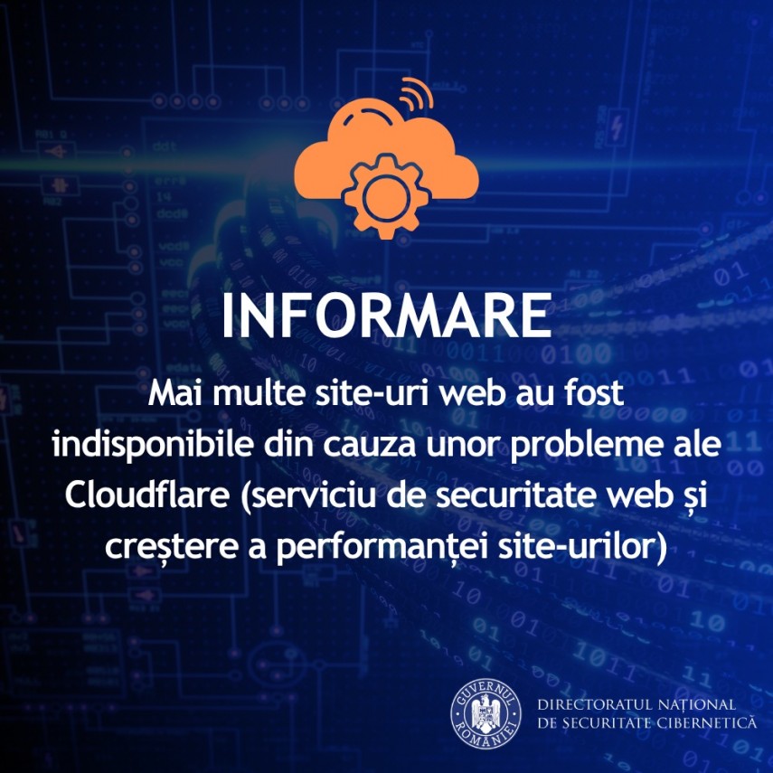 În cursul zilei de astăzi, mai multe site-uri web (inclusiv site-ul DNSC, dar și site-uri ale unor entități de presă sau rețele de socializare) au devenit indisponibile din pricina unor probleme de furnizare a serviciilor companiei Cloudflare. Problemele semnalate au fost remediate între timp.Potrivit DNSC, Cloudflare este o companie care oferă servicii de securitate și de creștere a performanței site-urilor web, funcționând ca un proxy invers care direcționează traficul dintre vizitatori și serverul unui site. Din cauza acestui rol intermediar, indisponibilitatea serviciilor companiei determină erori la accesarea site-urilor web aflate sub gestiune, fără să semnaleze o problemă cu infrastructura site-ului respectiv.