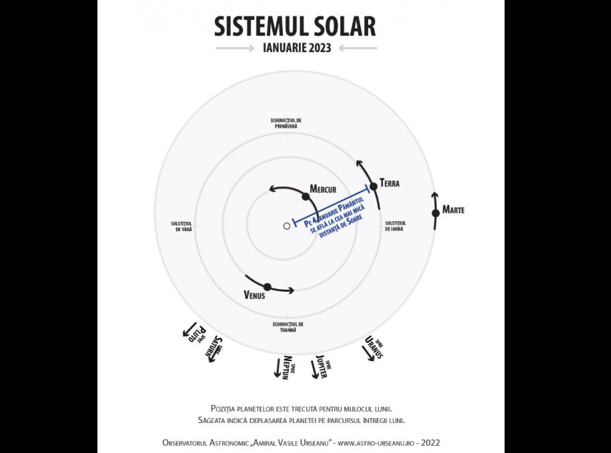 Pe 4 ianuarie ne aflăm la 147.101.021 km de Soare, cu 5 milioane de km mai aproape decât suntem vara., informează Observatorul Astronomic „Amiral Vasile Urseanu”.