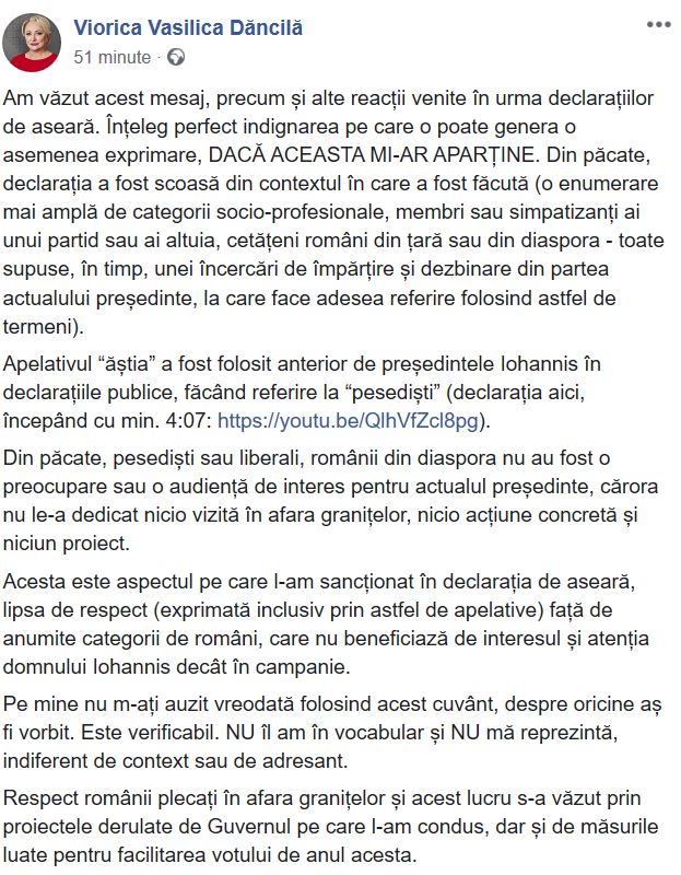Viorica Dăncilă, a declarat miercuri că a folosit apelativul ''ăştia'' în conferinţa de presă de marţi seară pentru a sancţiona faptul că preşedintele Klaus Iohannis l-a folosit anterior, în declaraţiile publice, făcând referire la ''pesedişti''.“Am văzut acest mesaj, precum și alte reacții venite în urma declarațiilor de aseară. Înțeleg perfect indignarea pe care o poate genera o asemenea exprimare, DACĂ ACEASTA MI-AR APARȚINE. Din păcate, declarația a fost scoasă din contextul în care a fost făcută (o enumerare mai amplă de categorii socio-profesionale, membri sau simpatizanți ai unui partid sau ai altuia, cetățeni români din țară sau din diaspora - toate supuse, în timp, unei încercări de împărțire și dezbinare din partea actualului președinte, la care face adesea referire folosind astfel de termeni).