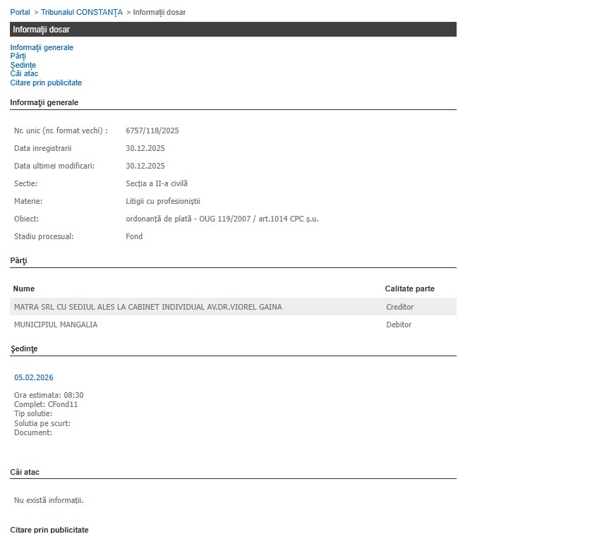 Matra SRL este reprezentată prin Cabinetul de Avocat Dr. Viorel Găină. Prima înfățișare în acest proces a fost deja stabilită pentru data de 5 februarie 2026, la Secția a II-a Civilă a Tribunalului Constanța
