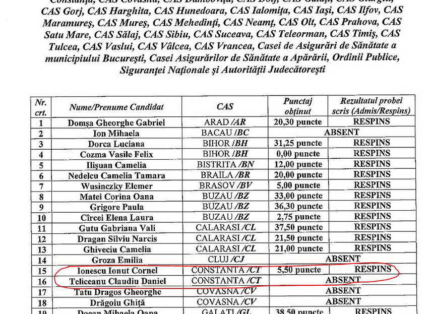 Casa Naţională de Asigurări de Sănătate (CNAS) a organizat un nou concurs pentru ocuparea funcţiilor contractuale de conducere vacante de preşedinte - director general pentru 42 de case judeţene de asigurări de sănătate, printre care şi cea constănţeană. Proba scrisă a avut loc pe 2 martie, urmând ca data şi ora interviului să fie comunicate ulterior.Pentru ocuparea funcţiei de preşedinte - director general al Casei Judeţene de Asigurări de Sănătate (CJAS) Constanţa au candidat Ionuţ Cornel Ionescu, care a obţinut la proba scrisă 5,50 puncte, şi Claudiu Daniel Teliceanu, care a absentat. Precizăm că Ionuţ Cornel Ionescu este fostul director al Spitalului Clinic CF Constanţa.