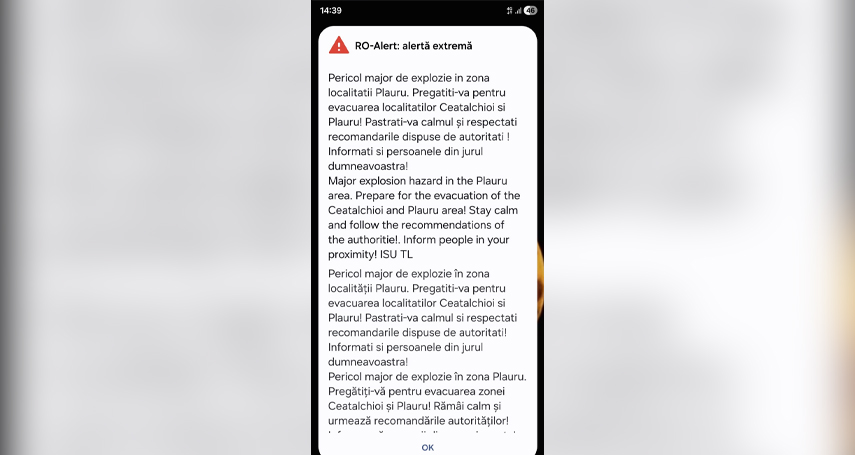 A fost transmis un mesaj RO -Alert pentru locuitorii din Ceatalchioi.