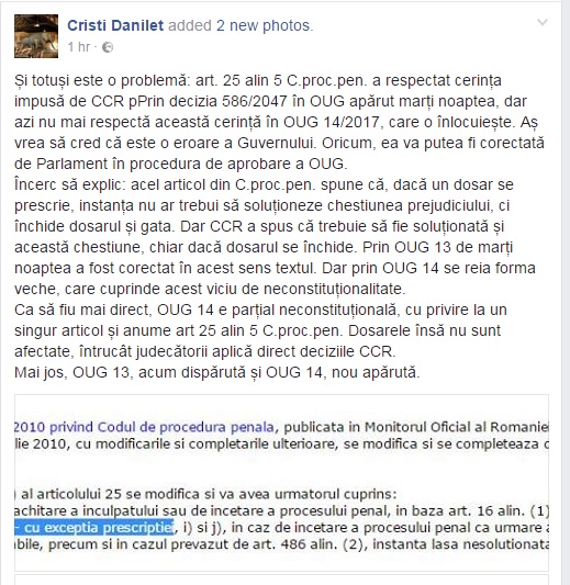 „Și totuși este o problemă: art. 25 alin 5 C.proc.pen. a respectat cerința impusă de CCR pPrin decizia 586/2047 în OUG apărut marți noaptea, dar azi nu mai respectă această cerință în OUG 14/2017, care o înlocuiește. Aș vrea să cred că este o eroare a Guvernului. Oricum, ea va putea fi corectată de Parlament în procedura de aprobare a OUG.