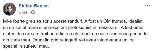 Ștefan Bănică Jr. a postat pe pagina personală de Facebook un mesaj de adio emoționant în amintirea jurnalistei Cristina Țopescu.”Mi-e foarte greu sa scriu aceste randuri. A fost un OM frumos, idealist, cu un suflet mare si un excelent profesionist in meseria ei. A fost omul alaturi de care am trait una dintre cele mai frumoase si intense perioade din viata mea. Drum lin printre ingeri! Vei avea intotdeauna un loc special in sufletul meu.”, scrie Ștefan Bănică Jr. pe pagina sa de Facebook.