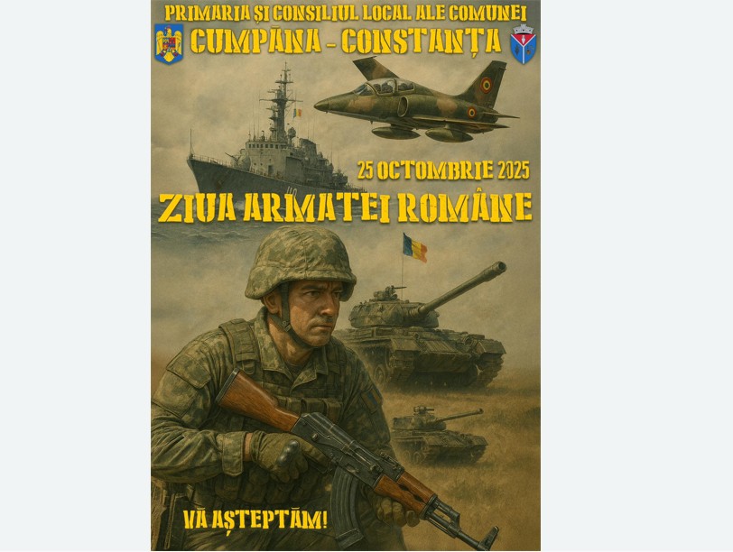 Primăria și Consiliul Local ale comunei Cumpăna, județul Constanța, organizează manifestările dedicate Zilei Armatei Române, un simbol al curajului, devotamentului și spiritului de sacrificiu al ostașilor noștri.