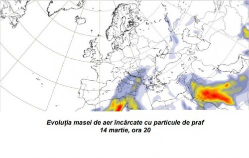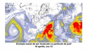 În perioada 23 aprilie ora 09 – 24 aprilie ora 13, circulația aerului, predominant sud-vestică, va favoriza avansul dinspre nordul Africii a unei mase de aer încărcată cu particule de praf de origine sahariană, către sud-estul Europei.