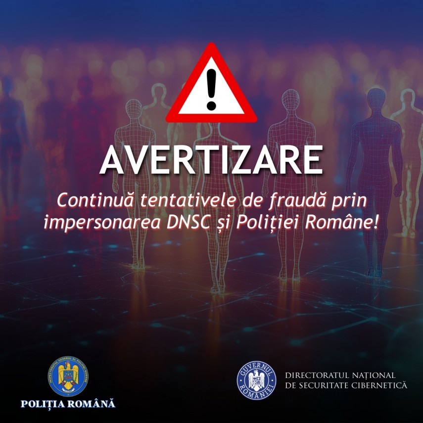 Directoratul Național de Securitate Cibernetică (DNSC), împreună cu Poliția Română, avertizează populația cu privire la o nouă campanie agresivă de fraudă online, aflată în plină desfășurare în România. Infractorii cibernetici folosesc în mod fraudulos numele și elementele de identitate vizuală ale celor două instituții pentru a induce panică și a obține bani sau date sensibile de la utilizatori.