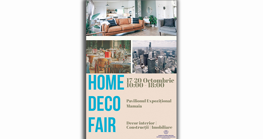 Camera de Comerţ, Industrie, Navigaţie şi Agricultură Constanţa organizează, în perioada 17 - 20 octombrie 2019, evenimentul Home Deco, ce se desfăşoară la Pavilionul Expoziţional din staţiunea Mamaia. Acesta reuneşte firme producătoare de mobilă, din domeniul imobiliar, design interior, gresie şi faianţă, covoare şi materiale de construcţii din întreaga ţară.