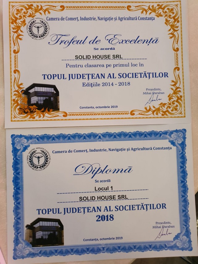 „Mulţumim Camerei de Comerţ, Industrie, Navigaţie şi Agricultură pentru recunoaşterea profesională pe care ne-o oferă an de an în cadrul evenimentului Topul Judeţean al Societăţilor din Constanţa. Suntem onoraţi că şi anul acesta ne-am clasat pe locul 1 la categoria din care facem parte, fapt ce întăreşte angajamentul nostru de a fi cei mai buni şi de a ne dezvolta în permanenţă“, a declarat Emel Veli, directorul de vânzări Solid House SRL.