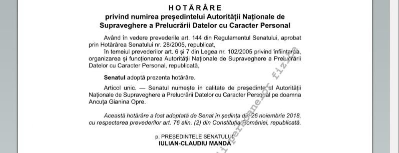 Opre a fost numită pentru încă cinci ani, mandatul preşedintelui ANSPDCP putând fi reînnoit, potrivit legii, o singură dată.