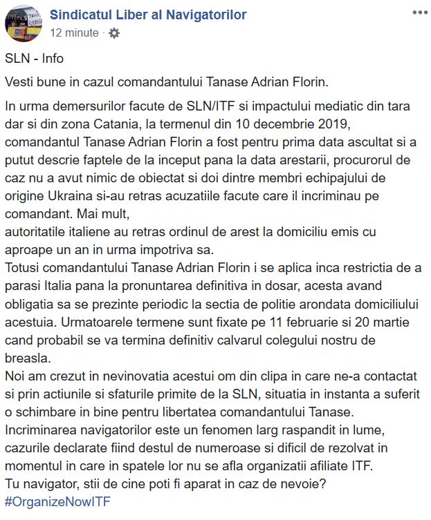 „În urma demersurilor facute de SLN/ITF si impactului mediatic din tara dar si din zona Catania, la termenul din 10 decembrie 2019, comandantul Tănase Adrian Florin a fost pentru prima data ascultat si a putut descrie faptele de la inceput pana la data arestarii, procurorul de caz nu a avut nimic de obiectat si doi dintre membri echipajului de origine Ukraina si-au retras acuzatiile facute care il incriminau pe comandant.