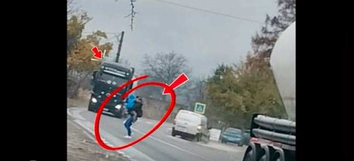 VIDEO. Mamă surprinsă traversând printre TIR-uri, cu copilul în brațe. „Indiferența poate să te lovească într-o bună zi“
