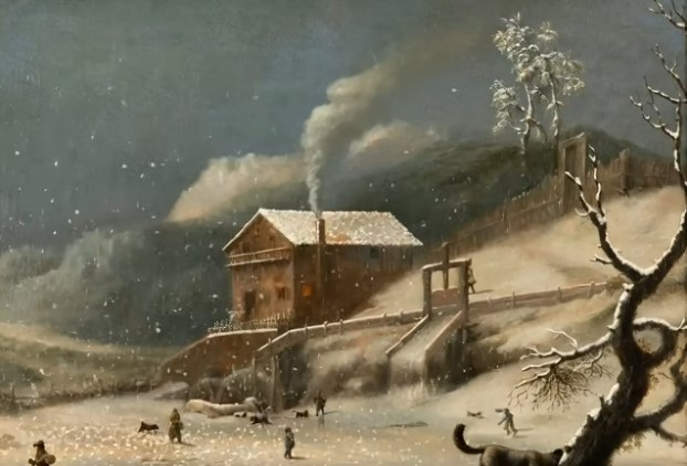 Scena redă un peisaj de iarnă complex, dominat de o instalație industrială care folosește forța apei, amplasată pe un deal înzăpezit. Clădirea, cu un horn masiv și luminată de flăcările din interior, sugerează mai degrabă o întreprindere metalurgică decât o moară de cereale. Apa este dirijată prin jgheaburi și stăvilare către roțile motrice, iar detaliile tehnice sunt redate cu o remarcabilă precizie.