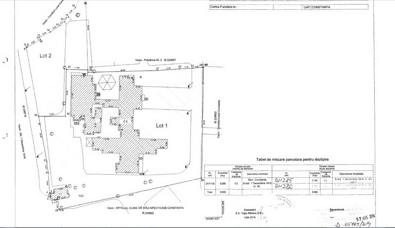 Pe data de 29 octombrie, consilierii judeţeni se vor întruni în şedinţă ordinară. Pe ordinea de zi se va afla şi proiectul de hotărâre privind aprobarea dezmembrării imobilului, proprietate a judeţului Constanţa, situat în municipiul Constanţa, bulevardul 1 decembrie 1018, nr. 4C. Potrivit proiectului de hotărâre, este vorba despre terenul cu număr cadastral 241118, în suprafaţă măsurată de 6.366 mp, cu destinaţia teren aflat în intravilan cu construcţiile C1-C2 în imobilele: nr. 241285 (lot 1) cu suprafaţa de 5.186 mp, nr. 241286 (lot 2) cu suprafaţa de 1.180 mp, conform referatului de admitere (dezmembrare imobil) nr. 65765/2014, emis de Oficiul de Cadastru şi Publicitate Imobiliară Constanţa. Imobilul situat în municipiul Constanţa, bulevardul 1 Decembrie 1918 nr. 4C, în suprafaţă totală de 6.366 mp, este proprietate publică a Judeţului Constanţa, fiind compus din teren încadrat în categoria „curţi construcţii“ şi construcţii cu destinaţia „construcţii administrative şi social culturale“. Ţinând cont de intenţia de realizare a investiţiei „Ansamblu de locuinţe cu regim de înălţime de P+5E şi 48 unităţi locative, destinat tinerilor specialişti din domeniul sănătăţii“, CJC Constanţa a achiziţionat servicii de „întocmire documentaţii cadastrale, topografice şi înscriere în Cartea funciară“ a imobilului de mai sus. Terenul a fost dezmembrat în două loturi, astfel încât să poată fi transmis în folosinţă gratuită Agenţiei Naţionale pentru Locuinţe în vederea edificării ansamblului de locuinţe.