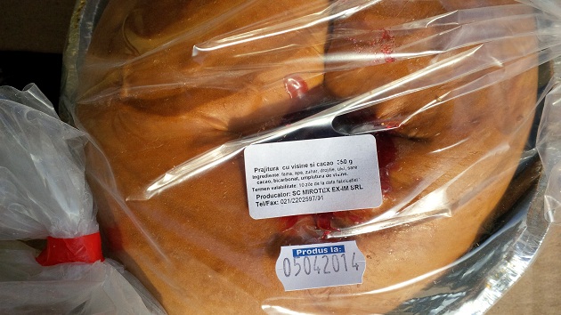 În plus, pe unul dintre cozonacii primiţi marţi la Mihail Kogălniceanu, după cum am arătat, erau suprapuse două etichete pe care era scrisă data producerii. Pe prima eticheta era scris „Produs la 28.03.2014“ (din 28 martie şi până pe 8 aprilie, când au ajuns produsele la Mihail Kogălniceanu, este o diferenţă de 11 zile), iar deasupra ei era lipită o altă etichetă pe care era notată data de 03.04.2014.