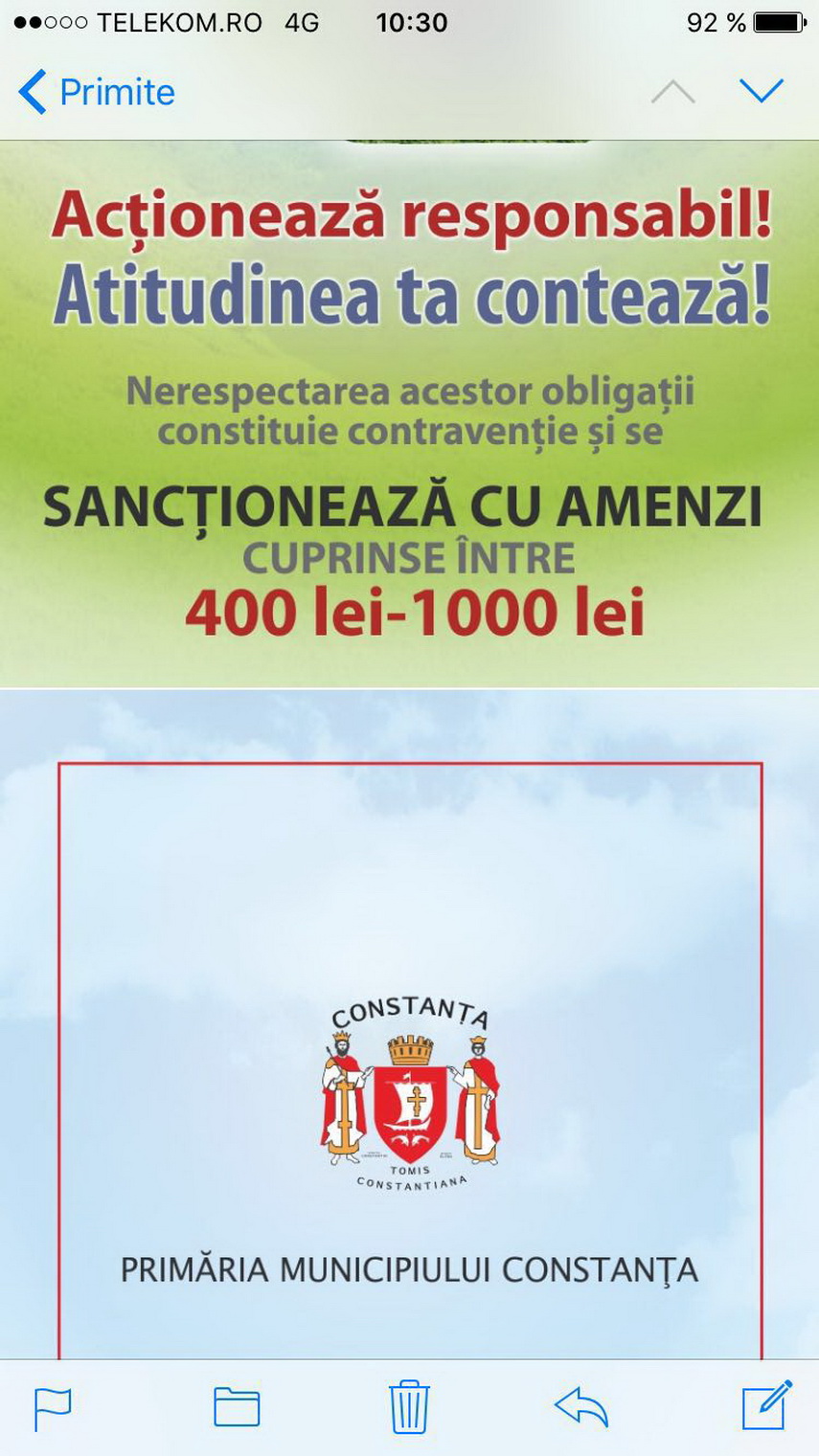 În această campanie, ce se va desfăşura sub sloganul „Acţionează responsabil! Atitudinea ta contează!“, constănţenii vor primi flyere prin care vor fi atenţionaţi că aruncarea unui rest de ţigară, a unei hârtii, a cojilor de seminţe sau a ambalajelor în orice loc de folosinţă publică le poate aduce amenzi cuprinse între 400 şi 800 de lei. Sancţiuni pecuniare riscă şi cei care îşi vor plimba animalele de companie prin parcuri sau alte locuri publice fără a avea „în dotare“ materiale care să le permită strângerea şi ridicarea dejecţiilor lăsate de patrupede.