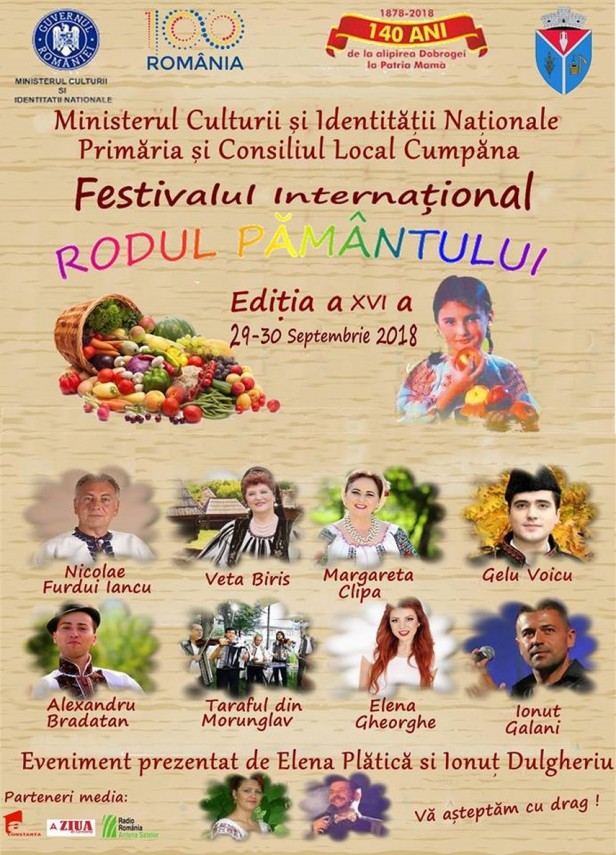 Primăria Cumpăna invită locuitorii comunei şi nu numai la Festivalul Internaţional „Rodul Pământului”, ajuns la cea de-a XV-a ediţie. Acest eveniment este dedicat gastronomiei româneşti şi internaţionale, pământului şi bogăţiei etnografice şi folclorice.Autoritatea publică locală organizează, în cadrul acestui eveniment, un concert de zile mari şi promite multă distracţie şi voie bună. Astfel, pe scenă vor urca pe scenă nume sonore ale muzicii folclorice, precum: Nicolae Furdui Iancu, Veta Biriş, Margareta Clipa, Gelu Voicu, Alexandru Bradatan. Taraful din Morunglav va fi şi el prezent la festival, iar interpreta Elena Gheorghe şi cântăreţul de muzică grecească Ionuţ Galani vor încinge atmosferă cu specific tradiţional. Gazdele festivalului folcloric vor fi îndrăgiţii Elena Plătică şi Ionuţ Dulgheriu.