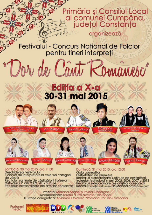 Concursul, deschis artiştilor amatori, solişti vocali din ţară, interpreţi ai cântecului popular românesc, cu vârste cuprinse între 6 şi 18 ani, este structurat pe trei secţiuni de vârstă, evoluţiile lor fiind acompaniate de Orchestra „Cristian Năstase“ din Bacău. Organizat cu sprijinul Primăriei Cumpăna, evenimentul se va desfăşura în sala de spectacole a Casei de Cultură din comună, pe data de 30 mai, începând cu ora 11.00. Gala laureaţilor şi festivitatea de premiere vor avea loc pe 31 mai, începând cu ora 12.00. 90 de concurenţi vor reprezenta, la Cumpăna, judeţele Alba, Argeş, Bacău, Braşov, Brăila, Bucureşti, Buzău, Caraş-Severin, Cluj, Constanţa, Dâmboviţa, Galaţi, Gorj, Ialomiţa, Iaşi, Ilfov, Mehedinţi, Mureş, Neamţ, Prahova, Satu Mare, Suceava, Tulcea, Vaslui şi Vrancea. Juriul este alcătuit din personalităţi ale folcloristicii româneşti. Preşedintele juriului, Elise Stan, realizator de emisiuni de folclor în cadrul TVR, va avea o misiune deosebit de dificilă, alături de ceilalţi membri: Paulina Popoiu - director al Muzeului Satului din Bucureşti, Doina Işfănoni - cercetător, etnolog în cadrul Muzeului Satului Bucureşti, Daniela Gibescu -specialist Electrecord România, Maria Magiru - directorul Muzeului de Artă Populară din Constanţa, Dorin Grama - director executiv Televiziunea Favorit, Valentin Marian - redactor-şef Radio România Antena Satelor. Recitalurile vor fi susţinute de nume de răsunet ale folclorului românesc - Matilda Pascal Cojocariţa, alături de Horia şi Ştefan Cigu, Mariana Anghel, Maria Șalaru, Ion Drăgan, precum şi câştigătorii trofeului festivalului din ediţiile anterioare - Alexandru Brădăţan, Beatrice Băndoiu, Ingrid Boengiu, Elena Coardă, Maria Mihăilă, Iulia Mihai şi Marius Brutaru.Urmareste-ne pe Grupul de Whatsapp