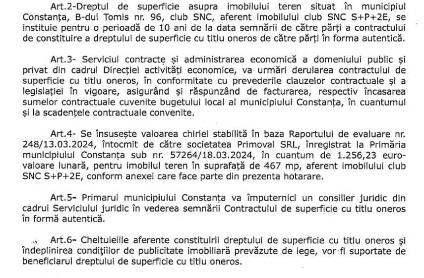 În plus, Primăria Constanța a eliberat, pe 5 martie 2024, un certificat de urbanism pentru vânzarea prin licitație publică cu respectarea dreptului de preempțiune al SC Tehno Construct SRL, cu funcțiunea aprobată conform PUD aprobat cu HCL 165/09.05.2006. Este vorba de CU 593, cu o valabilitate de 24 de luni.