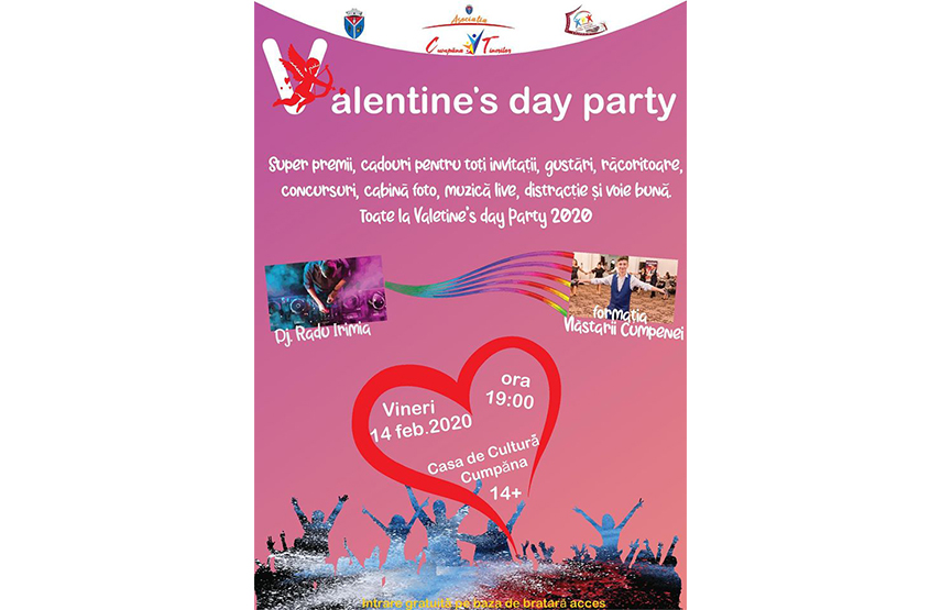 Evenimentul va avea loc vineri, 14 februarie, începând cu ora 19.00. Organizatorii promit o seara de neuitat, cu muzică, dans şi concursuri inedite. DJ Irimia şi “Vlăstarii Cumpenei” vor anima atmosfera de sărbătoare. Invitaţii vor avea la dispoziţie o cabină foto, unde îşi vor putea imortaliza clipele de bucurie, alături de partenerii lor. Totodată, organizatorii vor oferi, pe lângă gustări şi răcoritoare, câte un cadou simbolic pentru fiecare invitat.