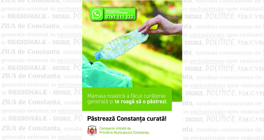 Primăria Constanţa şi Direcţia Generală Poliţia Locală lansează campania „Păstrează Constanţa Curată!“.În cadrul campaniei de informare şi conştientizare, angajaţii Direcţiei Generale Poliţia Locală vor împărţi flyere, pliante de informare în malluri, hoteluri din municipiu şi din staţiunea Mamaia. Afişele campaniei sunt deja prezente şi în autobuzele RATC, dar şi în unităţile de alimentaţie publică, acolo unde agenţii economici şi-au dat acordul, susţine reprezentantul Biroului de Presă al Primăriei Constanţa, Ionela Bărboi.