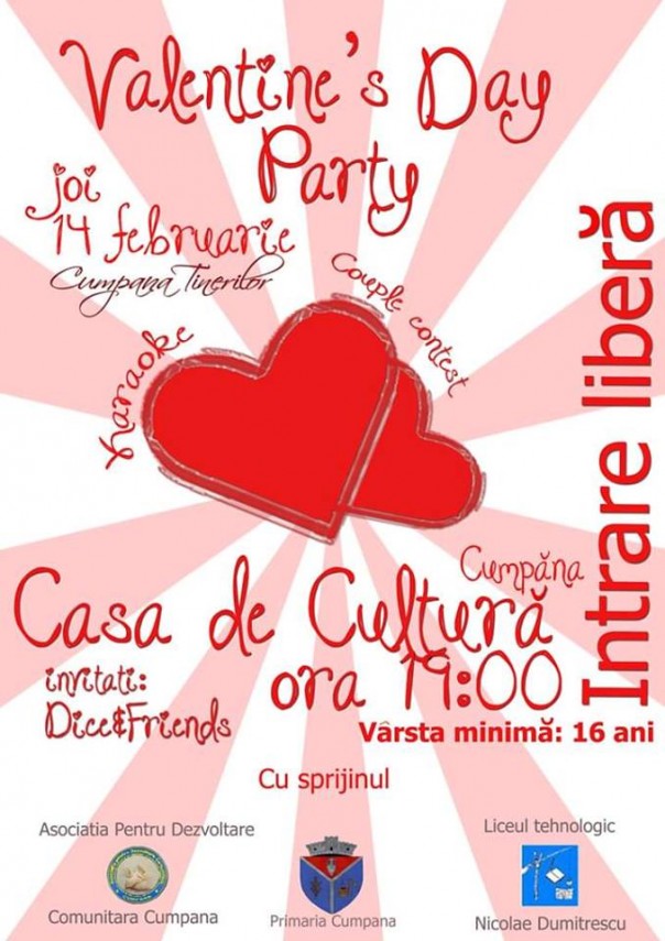 Sărbătoarea Sfântului Valentin va fi încărcată de voie bună pentru tinerii din comuna Cumpăna. Ziua de 14 februarie va fi plină de concursuri interactive cu premii, concursuri de dans, karaoke şi multe alte momente.Primăria şi Consiliul Local al Comunei Cumpăna, reprezentate legal prin primarul ec. Mariana Gâju, în colaborare cu Asociaţia pentru Dezvoltare Comunitară Cumpăna şi Liceul Tehnologic „Nicolae Dumitrescu“, organizează o serie de activităţi culturale dedicate tinerilor, cu prilejul zilei de Valentine's Day. Manifestările vor fi găzduite de sala de spectacole a Casei de Cultură din comuna Cumpăna, joi, 14 februarie, începând cu ora 19.00. Invitat special: Dice&Friends.
