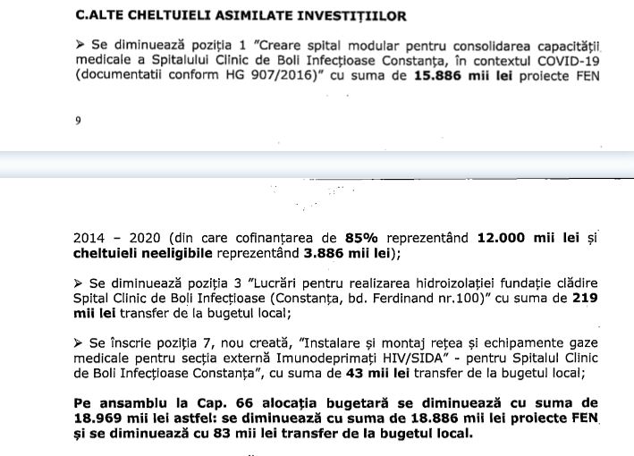 Tot la rectificare s-a mai renunțat și la alți 3.000.000 de lei din proiectul de creștere a eficienței energetice a imobilului Spitalului Municipal Constanța dar și aproape 220.000 lei din proiectul care viza realizarea hidroizolației fundației clădirii în care funcționează Spitalul Clinic de Boli Infecțioase.