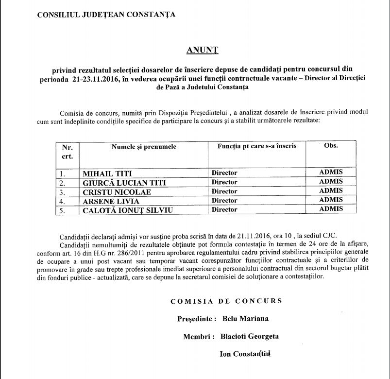 Pe data de 14 noiembrie Consiliul Județean Constanța a făcut publice numele candidaților admiși pentru a ocupa funcția contractuală vacantă de director al Direcției Județene de Pază Constanța. Conform anunțului la care facem referire, și pe care îl prezentăm anexat, în ordinea trecută pe tabel, au fost admise, ca fiind complete, dosarele prezentate de Titi Mihail, Lucian Titi Giurcă, Nicolae Cristu, Livia Arsene și Ionuț Silviu Calotă.