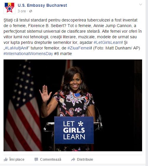 „Ştiaţi că testul standard pentru descoperirea tuberculozei a fost inventat de o femeie, Florence B. Seibert? Tot o femeie, Annie Jump Cannon, a perfecţionat sistemul universal de clasificare stelară. Alte femei vor oferi în viitor lumii noi tehnologii, creaţii literare, muzicale, modele de urmat sau vor lupta pentru drepturile semenilor lor, aşadar #LetGirlsLearn! Şi „#LaMulţiAni!” tuturor femeilor, de #ZiuaFemeii!”