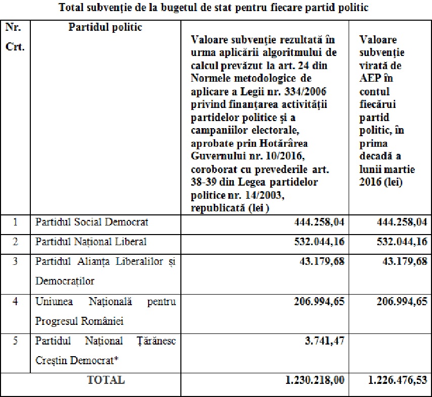 „Acordarea subvenţiei lunare de la bugetul de stat Partidului Naţional Ţărănesc Creştin Democrat, determinată potrivit algoritmului de repartizare a subvenţiei prevăzut în Normele metodologicede aplicare a Legii nr. 334/2006, aprobate prin Hotărârea Guvernului nr. 10/2016, a fost suspendată prin Decizia Preşedintelui AEP nr. 4 din 19.01.2016 şi va fi păstrată în sumă de mandat potrivit prevederilor art. 24 alin. (5) din Legea nr. 334/2006, republicată”, se arată în comunicatul transmis de AEP.