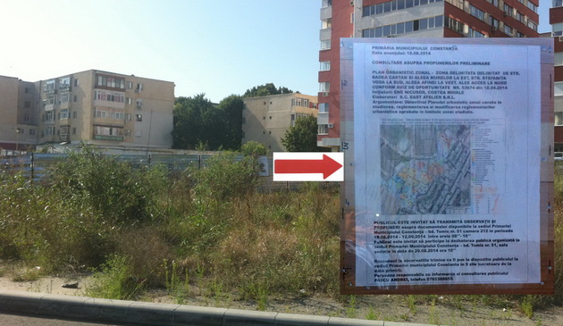 Anunţul a fost postat pe pagina oficială de Internet a Primăriei pe 18 august. Însă la faţa locului, acolo unde ar urma să răsară mai multe blocuri cu regim maxim de înălţime de P+11, a fost montat un singur panou informativ. Dar nu oriunde, ci tocmai în boscheţi, într-un loc greu accesibil şi aproape imposibil de observat! Obligaţia legală a publicităţii acestui proiect de dezvoltare urbană care va afecta sute de locanici din zonă a fost îndeplinită... de formă. Ca dovadă, trecătorii chestionaţi de reporterii Constanta.ro nu ştiau de existenţa panoului din boscheţi, iar despre proiectul care le va umple orizontul cu blocuri-turn aveau cunoştinţă doar din zvonuri.