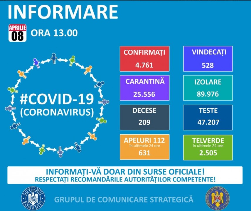 Până astăzi, 8 aprilie, pe teritoriul României, au fost confirmate 4.761 de cazuri de persoane infectate cu virusul COVID – 19 (coronavirus). Dintre persoanele confirmate pozitiv, 528 au fost declarate vindecate și externate.